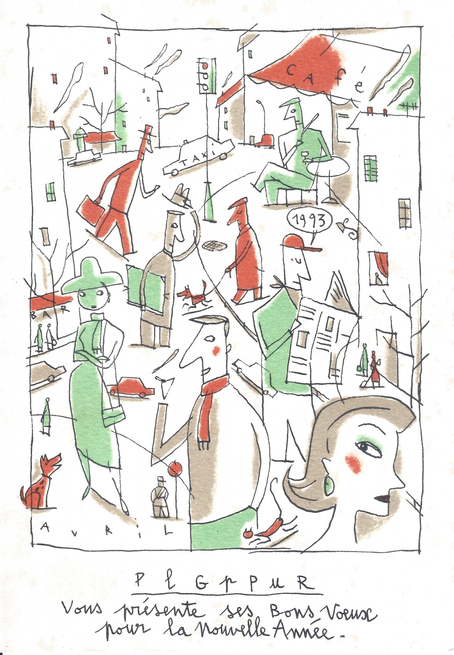1992 – Carte de voeux pour 1993, ill. 3 coul. De François AVRIL (PLGPPUR vous présente ses bon voeux pour la nouvelle année), lithographie 300 ex. format 15 x 22 cm